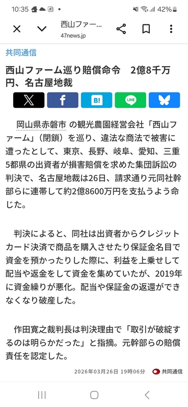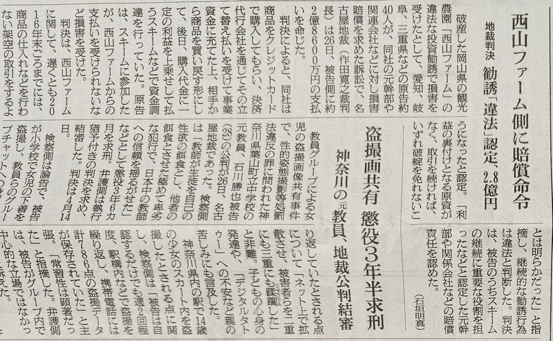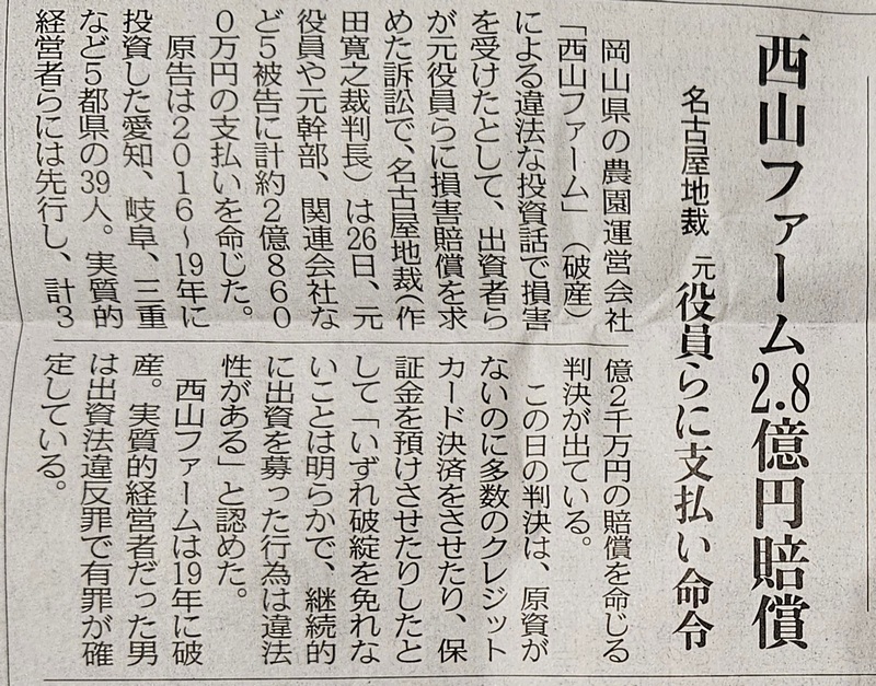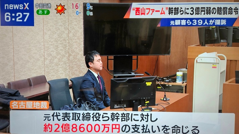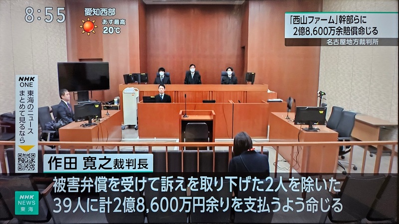名古屋地裁令和8年3月26日判決 「岡山県の観光農園会社西山ファームによる違法な投資勧誘で損害を受けたとして、愛知、岐阜、三重など5都県の原告39名が、西山ファームの元幹部や関連会社などに対し損害賠償を求めた集団訴訟において、西山ファームの元役員や元幹部、関連会社など5被告に対し、総額約2億8600万円の損害賠償責任を認めた判決」 (令和8年3月26日CBCテレビ「newsX」で報道) (令和8年3月26日NHKテレビ「ニュース845東海」で報道) (令和8年3月26日東海テレビ「FNN Live News α」で報道) (令和8年3月26日共同通信「47NEWS」で報道) (令和8年3月27日付け中日新聞朝刊で報道) (令和8年3月27日付け朝日新聞朝刊で報道) |